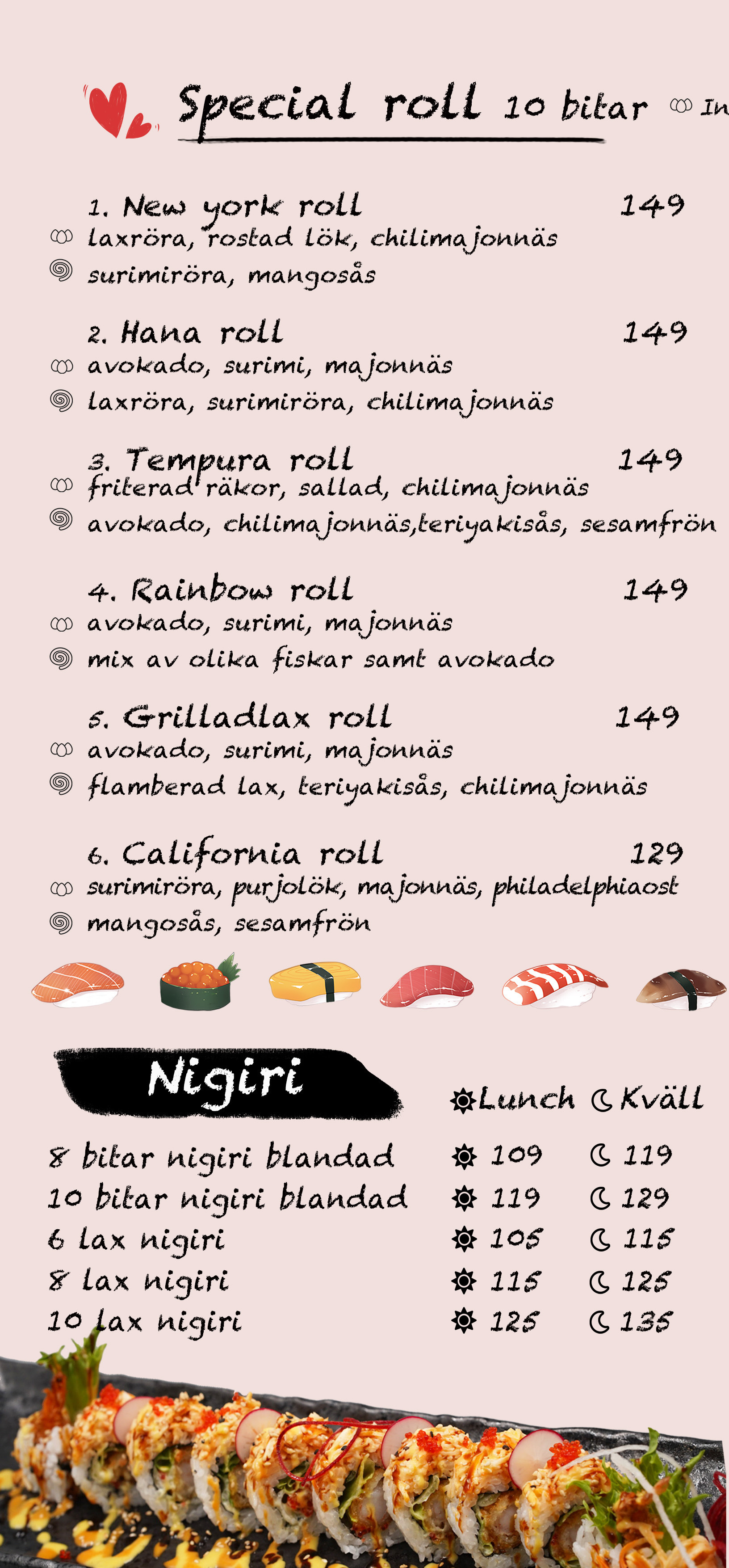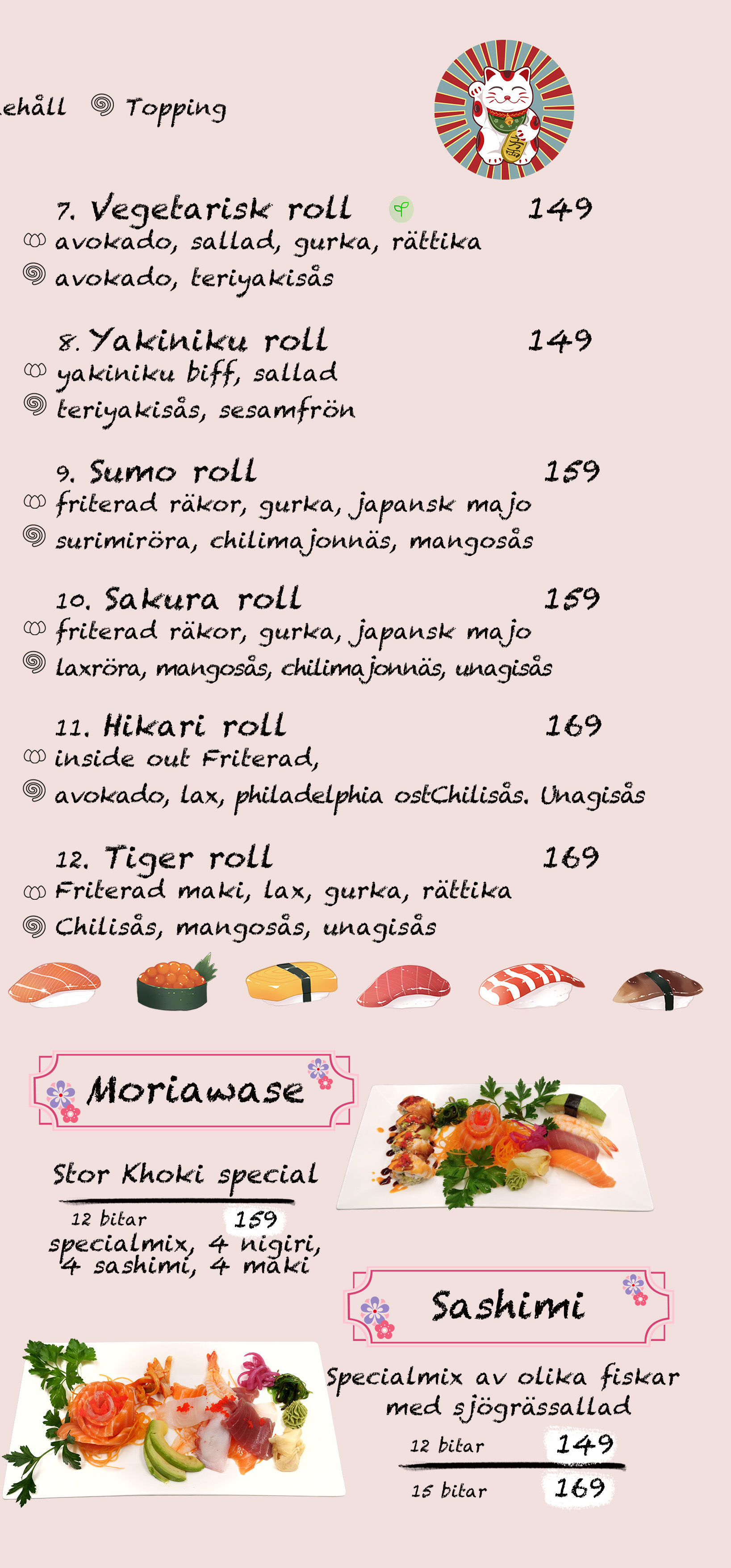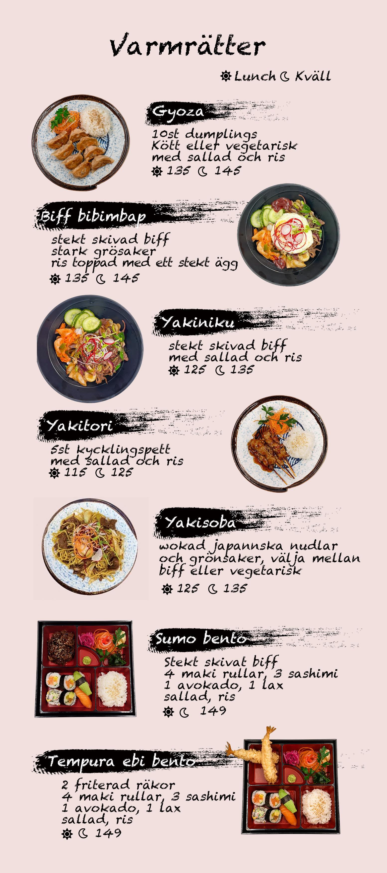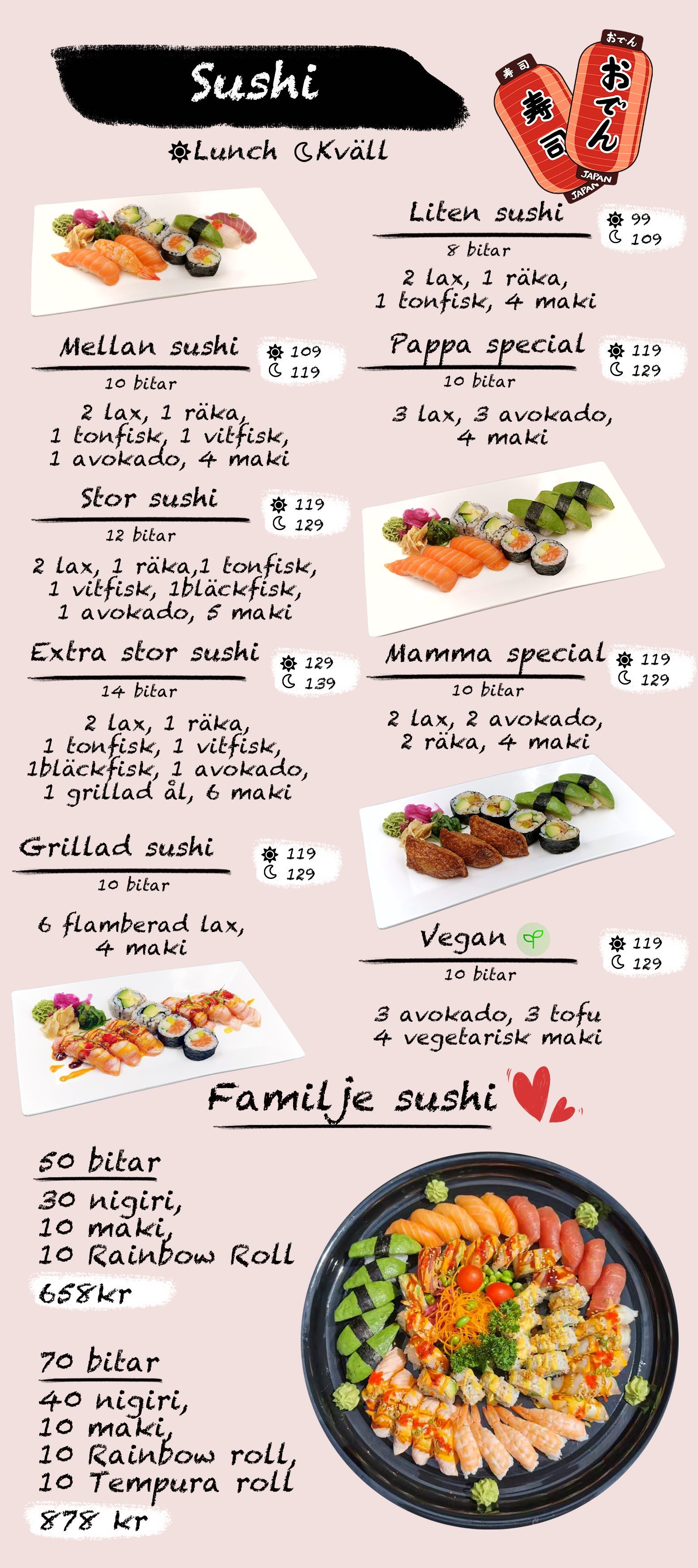 För oss är sushi mer än bara mat. Det är en konstform. Vår ägare Khoki är själv en erfaren sushi-kock och har bland annat drivit en sushi-restaurang i Tokyo. I över 15 år har vi serverat sushi på noggrant utvalda råvaror, tillredda med kärlek och omsorg. Vi serverar klassisk sushi på japanskt vis, men också många spännande special-sushi rätter för den som vill prova något nytt.